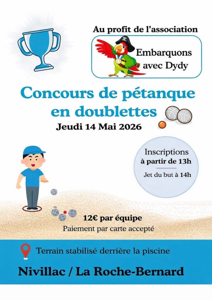 « Tous les Évènements Concours de pétanque en doublettes jeudi 14 mai à 13 h 00 - 22 h 00 Détails Date : jeudi 14 mai Heure : 13 h 00 - 22 h 00 Ajouter au calendrier Google Agenda iCalendar Outlook 365 Outlook Live